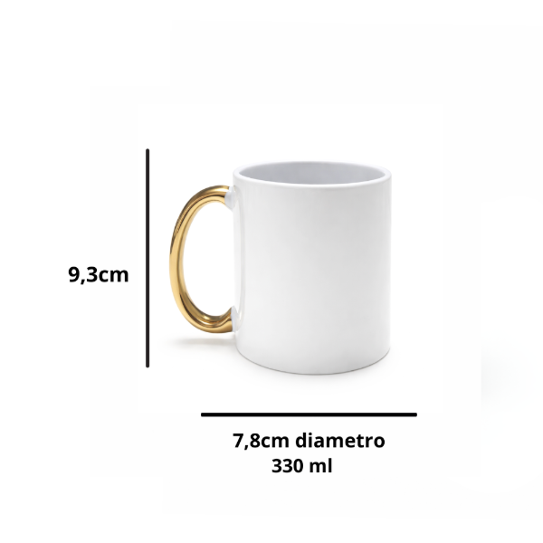 Taza de cerámica blanca de alta calidad con elegante manija dorada metalizada, ideal para crear productos personalizados con un acabado sofisticado y diferencial. Perfecta para regalos especiales, marcas premium y líneas exclusivas de sublimación.